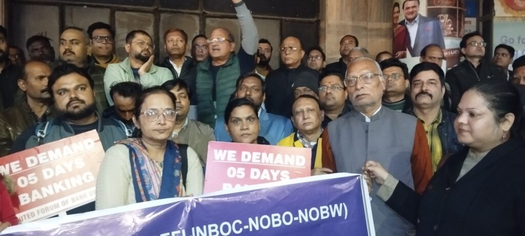 5-डे बैंकिंग लागू करने की प्रमुख मांग को लेकर देश भर के बैंककर्मी आर-पार की लड़ाई की पूरी तैयारी हैं केंद्रीय श्रम आयुक्त की मध्यस्थता में नई दिल्ली में हुई वित्त मंत्रालय, भारतीय बैंक संघ और यूनाइटेड फोरम ऑफ बैंक यूनियंस की बैठक बेनतीजा रही वार्ता विफल होने के बाद अब आगामी 27 जनवरी को देश के 8 लाख बैंक अधिकारी और कर्मचारी राष्ट्रव्यापी हड़ताल पर रहेंगे हालांकि, हड़ताल टालने के लिए 23 जनवरी को एक बार फिर सुलह वार्ता बुलाई गई है, यूनाइटेड फोरम कानपुर इकाई के संयोजक रजनीश गुप्ता ने प्रदर्शनकारियों को संबोधित करते हुए कहा कि यह हड़ताल बैंककर्मियों पर थोपी गई है उन्होंने बताया कि IBA और यूनाइटेड फोरम के बीच 5-डे बैंकिंग लागू करने के लिए प्रतिदिन 40 मिनट कार्य समय बढ़ाने पर सहमति बन चुकी थी और बैंक संघ ने इसे सरकार को भेज भी दिया था, लेकिन पिछले दो वर्षों से यह प्रस्ताव सरकार के पास लंबित है सरकार की इस चुप्पी और नकारात्मक रवैये के कारण ही बैंक कर्मियों को आंदोलन का रास्ता चुनना पड़ा है हड़ताल के समर्थन में कानपुर की 12 बैंकों के अधिकारियों और कर्मचारियों ने यूनाइटेड फोरम के तत्वावधान में अपनी शक्ति का प्रदर्शन किया प्रदर्शनकारी ‘इंडियन बैंक’ बड़ा चौराहा पर एकत्रित हुए, जहाँ से ‘बैंक ऑफ इंडिया’ फूलबाग तक विशाल जुलूस निकाला गया इस दौरान बैंककर्मियों ने अपनी मांगों के समर्थन में जमकर नारेबाजी की जुलूस के दौरान सह-संयोजक प्रवीण मिश्रा, नेशनल कंफेडरेशन के जय प्रकाश मिश्र, ऑल इंडिया बैंक ऑफिसर के अंकुर मिश्रा, यूपी बैंक एम्प्लॉइज यूनियन के अध्यक्ष मनोज तिवारी व संयुक्त मंत्री अंकुर द्विवेदी और पीएनबी स्टाफ के चेयरमैन अनिल सोनकर ने भी सरकार की नीतियों की आलोचना की विरोध प्रदर्शन में मुख्य रूप से अरविंद द्विवेदी, राजकुमार, सुनील शुक्ला, अनुराग सिंह, सचिन अग्रवाल, पुष्कर मिश्रा, अंशुमान तिवारी, शिवांगी द्विवेदी, केएम शुक्ल, शिवम निगम, राजीव धवन, अंकित अवस्थी, नितिन शर्मा, बृजेंद्र पांडे, आरके पांडे, शोभित शुक्ला, राजेश गुप्ता और धर्मराज सहित सैकड़ों बैंककर्मी शामिल रहे यदि 23 जनवरी की वार्ता सफल नहीं होती है, तो 27 जनवरी को बैंकिंग सेवाएं पूरी तरह ठप रह सकती हैं