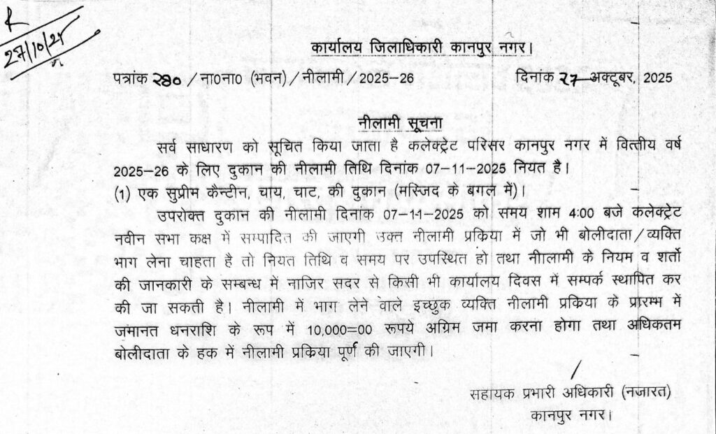 कानपुर सहायक प्रभारी अधिकारी (नजारत) ने सर्व साधारण को सूचित किया हैं कि कलेक्ट्रेट परिसर कानपुर नगर में वित्तीय वर्ष 2025-26 के लिये एक सुप्रीम कैन्टीन, चाय, चाट, की दुकान (मस्जिद के बगल में) की नीलामी तिथि दिनांक 07 नवम्बर, 2025 नियत है।
