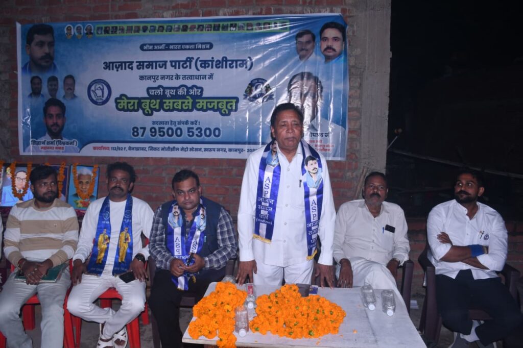 कानपुर, आज़ाद समाज पार्टी (कांशीराम) कानपुर नगर को मजबूती प्रदान करने हेतु “चलो बूथ की ओर – मेरा बूथ सबसे मजबूत” कार्यक्रम के तहत मुख्य अतिथि मा राम गोपाल बाबू (प्रदेश संगठन मंत्री व मुख्य कानपुर मंडल प्रभारी) व विशिष्ठ अतिथि तुलसीराम वाल्मीकि,राजू अंसारी व गंगाराम पाल की उपस्थिति में कार्यक्रम का आयोजन निम्नवत हुआ।महाराजपुर विधानसभा के वार्ड 62 स्वर्ण जयंती विहार स्थिति एस एस गैलेक्सी में कार्यक्रम का आयोजन हुआ जिसमें रूपा गौतमी महानगर संगठन मंत्री उमेश कुमार वार्ड अध्यक्ष (वार्ड 46 यशोदा नगर पूर्वी)आकाश कुमार वार्ड महासचिव (वार्ड 24 कृष्णा नगर) राम विजय सेक्टर अध्यक्ष क्रम सं. 10 रंजीत कुमार राजपूत 187 बूथ अध्यक्ष,दीपू 188 बूथ अध्यक्ष आयुष कुमार 189 बूथ अध्यक्ष,राज कनौजिया 191 बूथ अध्यक्ष व गोविंद नगर विधानसभा* स्थित दादा नगर में कार्यक्रम का आयोजन हुआ, जिसमें चरन नारायण महानगर उपाध्यक्ष,सुनील कुमार जी: वार्ड अध्यक्ष (वार्ड 63) सौरभ गोविंद नगर विधानसभा सचिव शिव पूजन,गोविंद नगर विधानसभा सचिव
