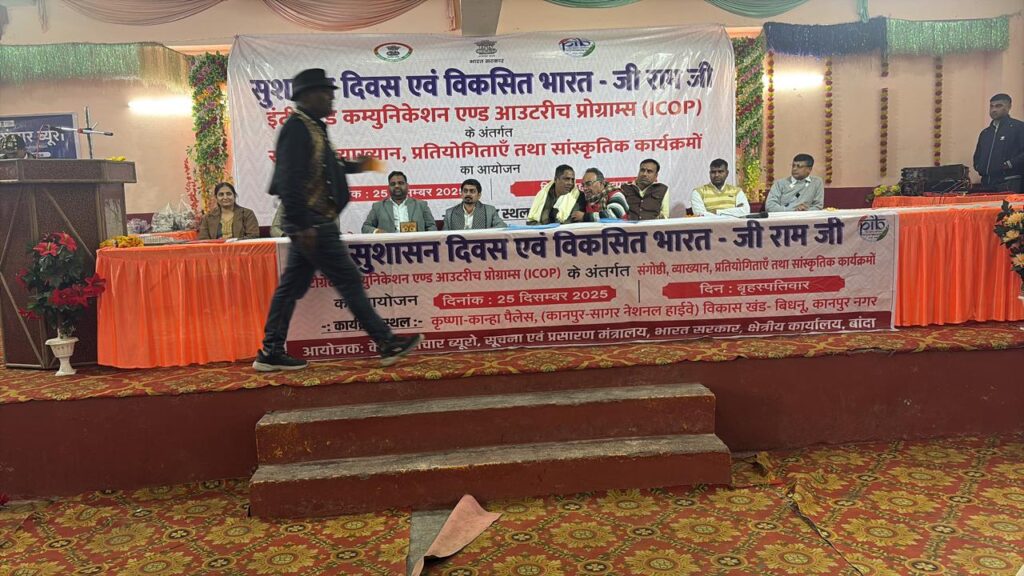 जिले के बिधनू विकास खंड में आयोजित इस कार्यक्रम का विषय था सुशासन दिवस एवं विकसित भारत- जी राम जी। कार्यक्रम में एक विषयागत प्रश्नोत्तरी प्रतियोगिता का आयोजन कर 20 विजयी प्रतिभागियों को विभाग द्वारा पुरस्कृत किया गया। साथ ही विभाग के नामित जादूगर सुरेश एंड पार्टी द्वारा मनोरंजक माध्यम से लोगों को सुशासन दिवस एवं वीबी- जी राम जी के बारे में जागरूक किया गया।