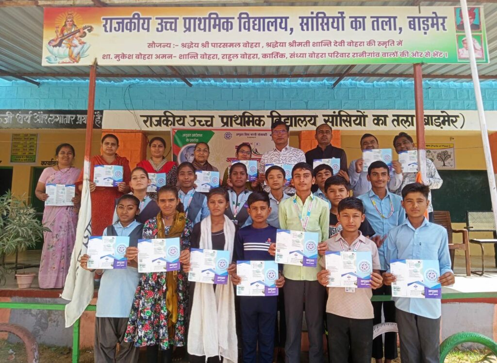 बाड़मेर। 77वें अणुव्रत स्थापना दिवस पर शनिवार को राजकीय उच्च प्राथमिक विद्यालय सांसियों का तला में अणुव्रत समिति, बाड़मेर की ओर से प्रधानाध्यापिका गुंजन आचार्य, समिति के सचिव गौतम बोथरा व प्रभारी मुकेश बोहरा अमन की उपस्थिति में अणुव्रत शपथ कार्यक्रम आयोजित हुआ।