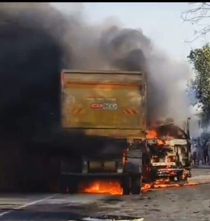 टक्कर के बाद जला डंपर, एक के चालक की मौत व आटो सवार 11 लोग घायल