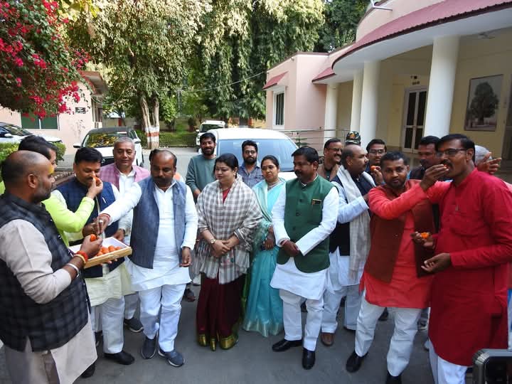 दिल्ली और मिल्कीपुर की जीत पर भाजपाइयों ने मनाया जश्न, बांटी मिठाई